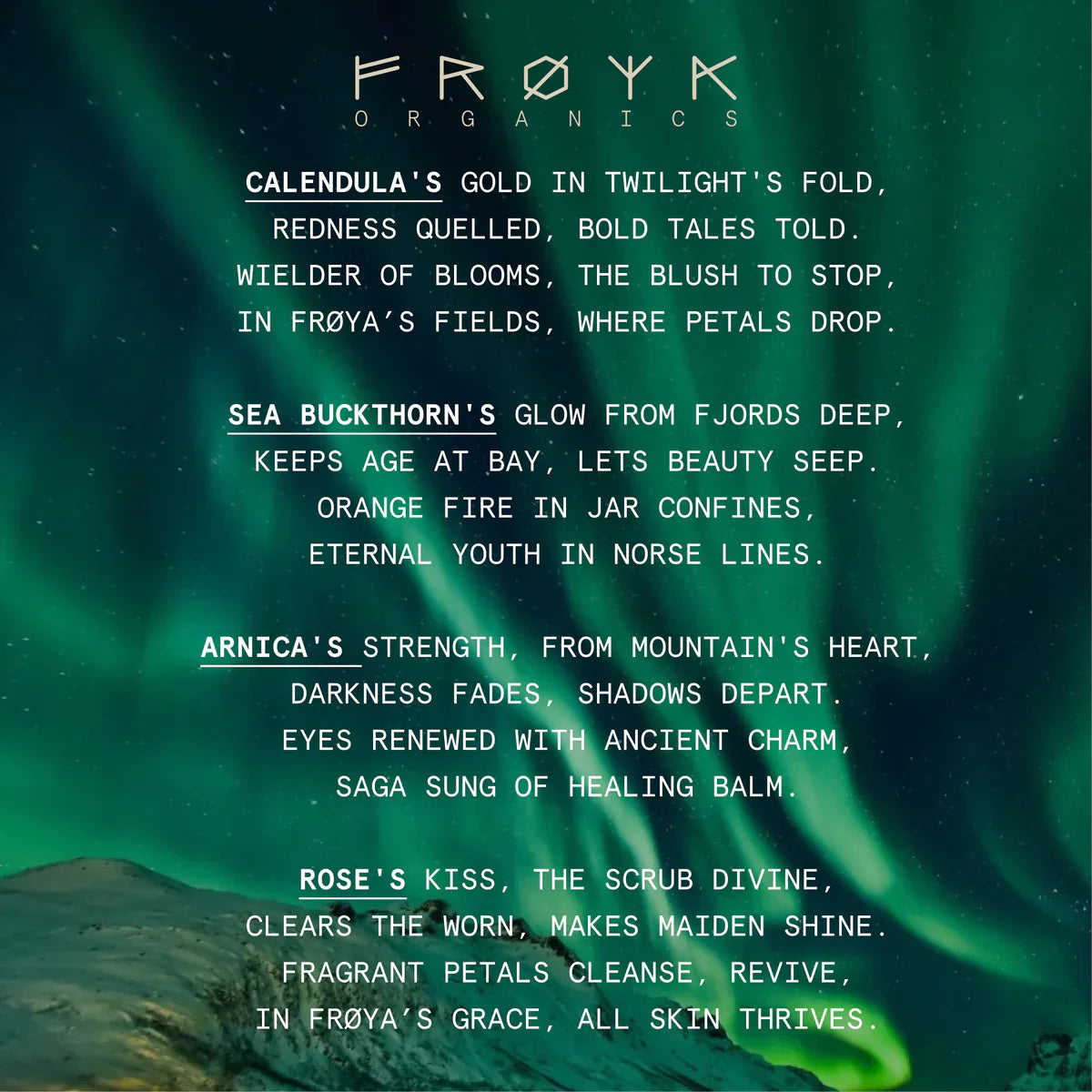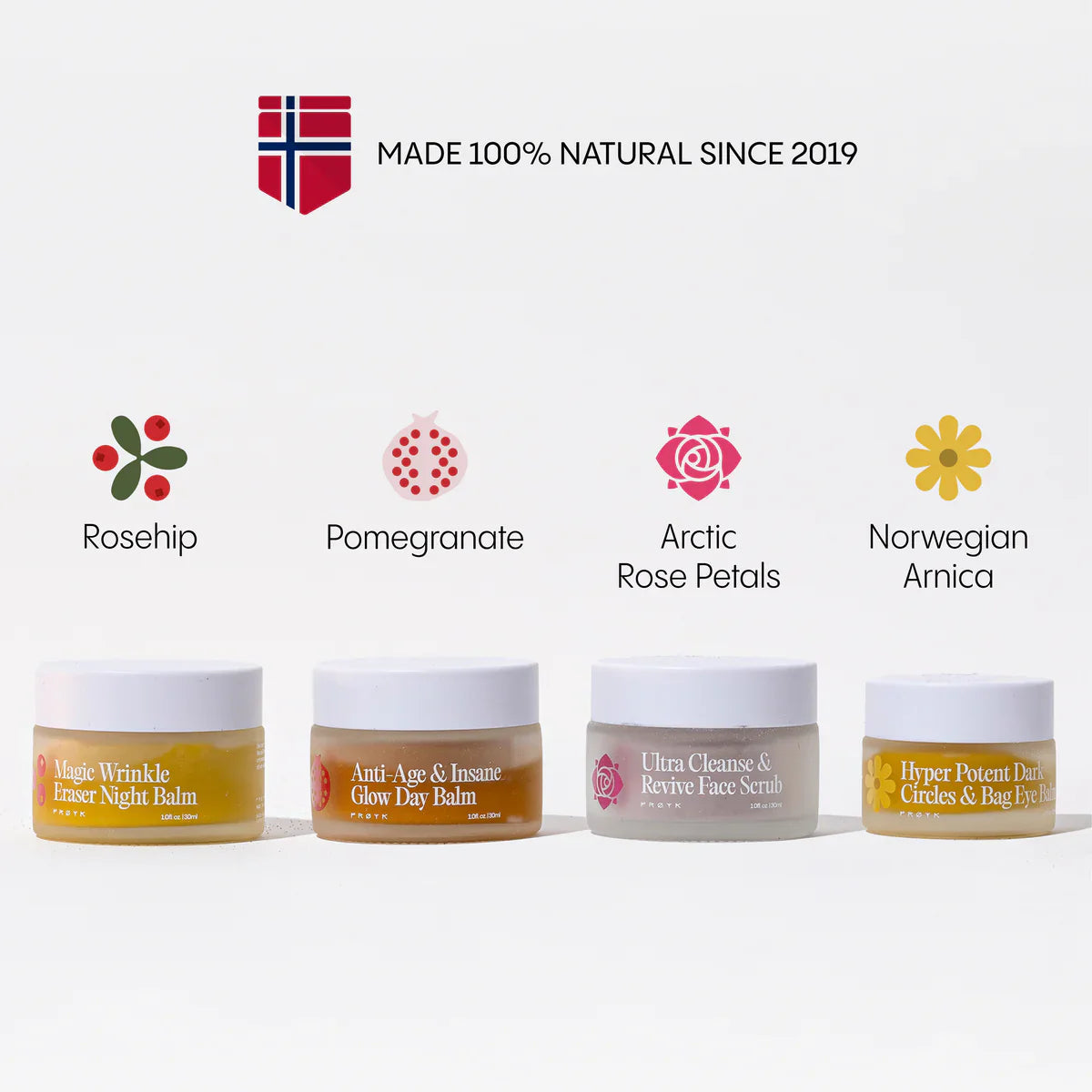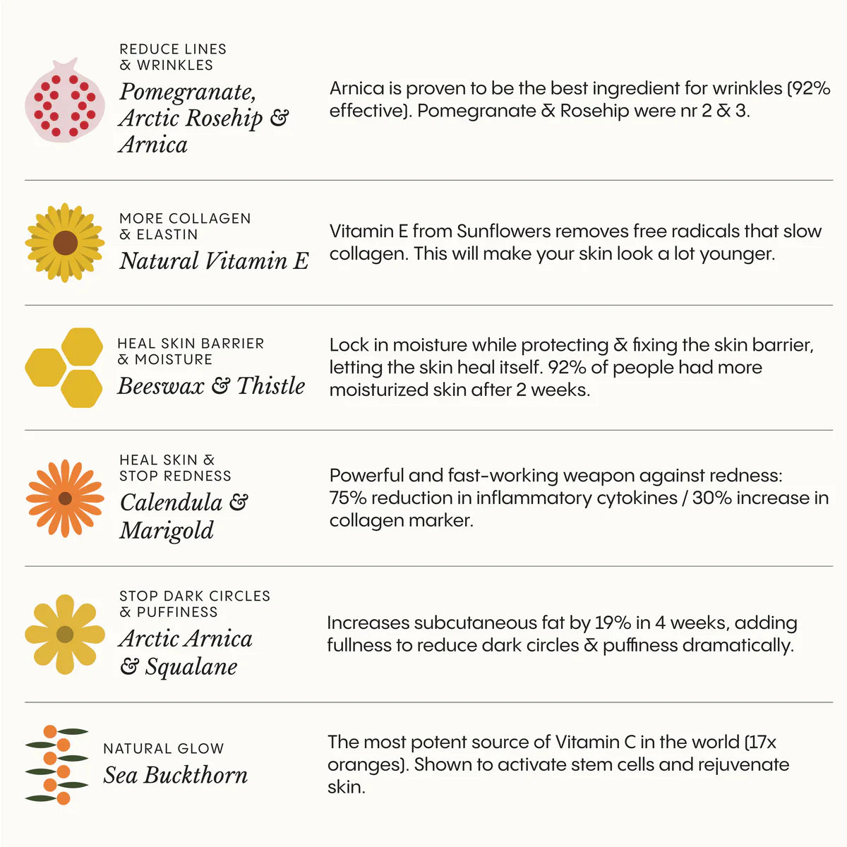 ingredients were tested on humans for anti-ageing and our main ingredient Arnica was proven most effective (Study). We source it wild on the Norwegian mountainside to capture the maximal antioxidant potential